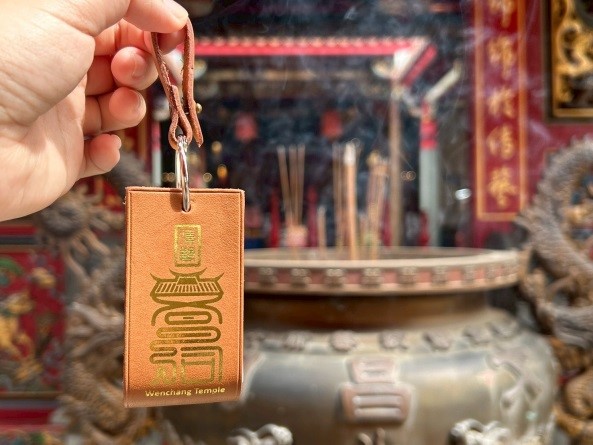 透明款的原住民串珠,搭配具有吉祥含意的特色珠,為旅客帶來美好祝福或是文昌祠皮革記事吊飾,可進行皮革敲印,文昌帝君保佑一切順利,事業亨通。